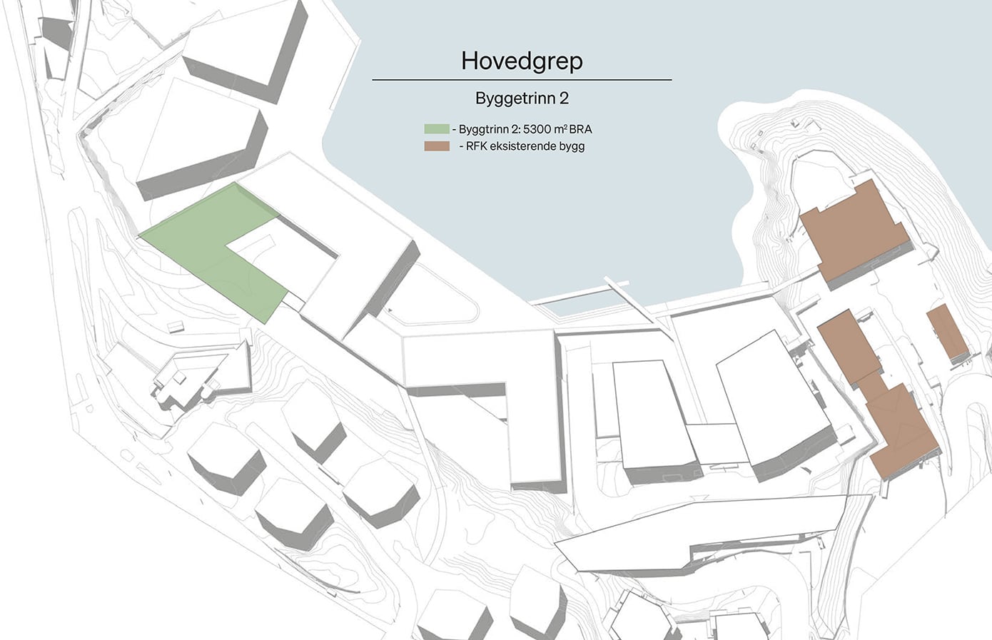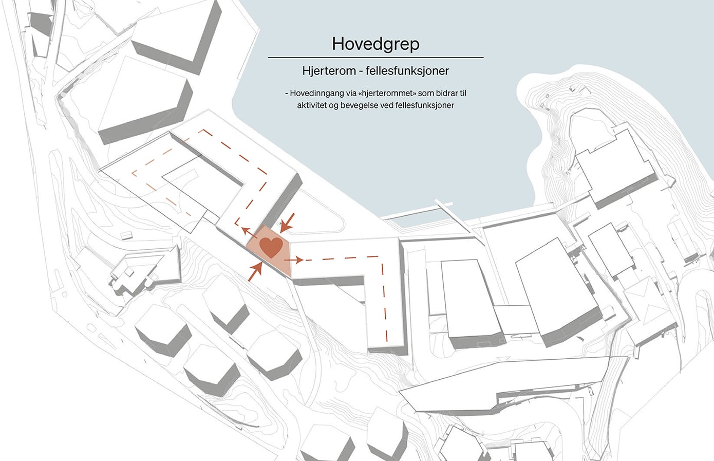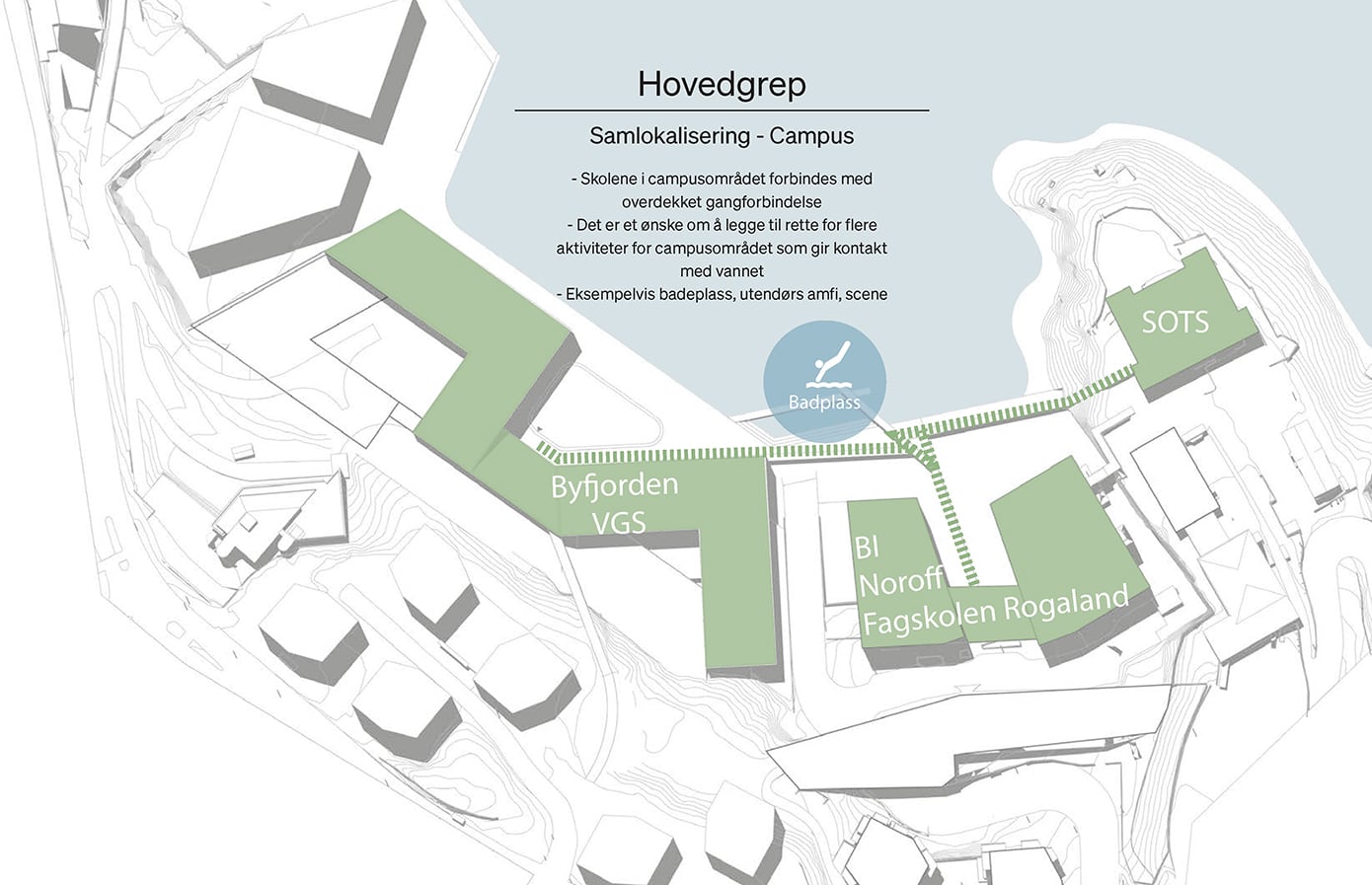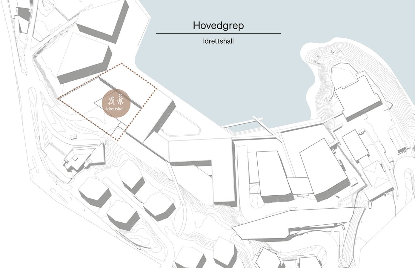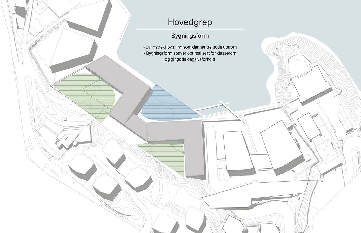 Hovedgrepet viser hvordan skolebygget kan plasseres og organiseres på tomten i samspill med eksisterende bygg og omgivelser. Grepet illustrerer en mulig struktur for volum, utearealer og forbindelser, der bygningene danner tydelige rammer for skolegård, gode møteplasser og effektive atkomster. Samtidig legges det til rette for gode koblinger til campusområdet, fjorden og omkringliggende bystruktur.