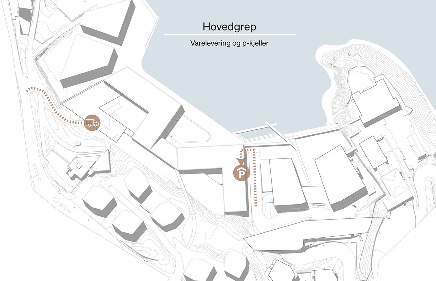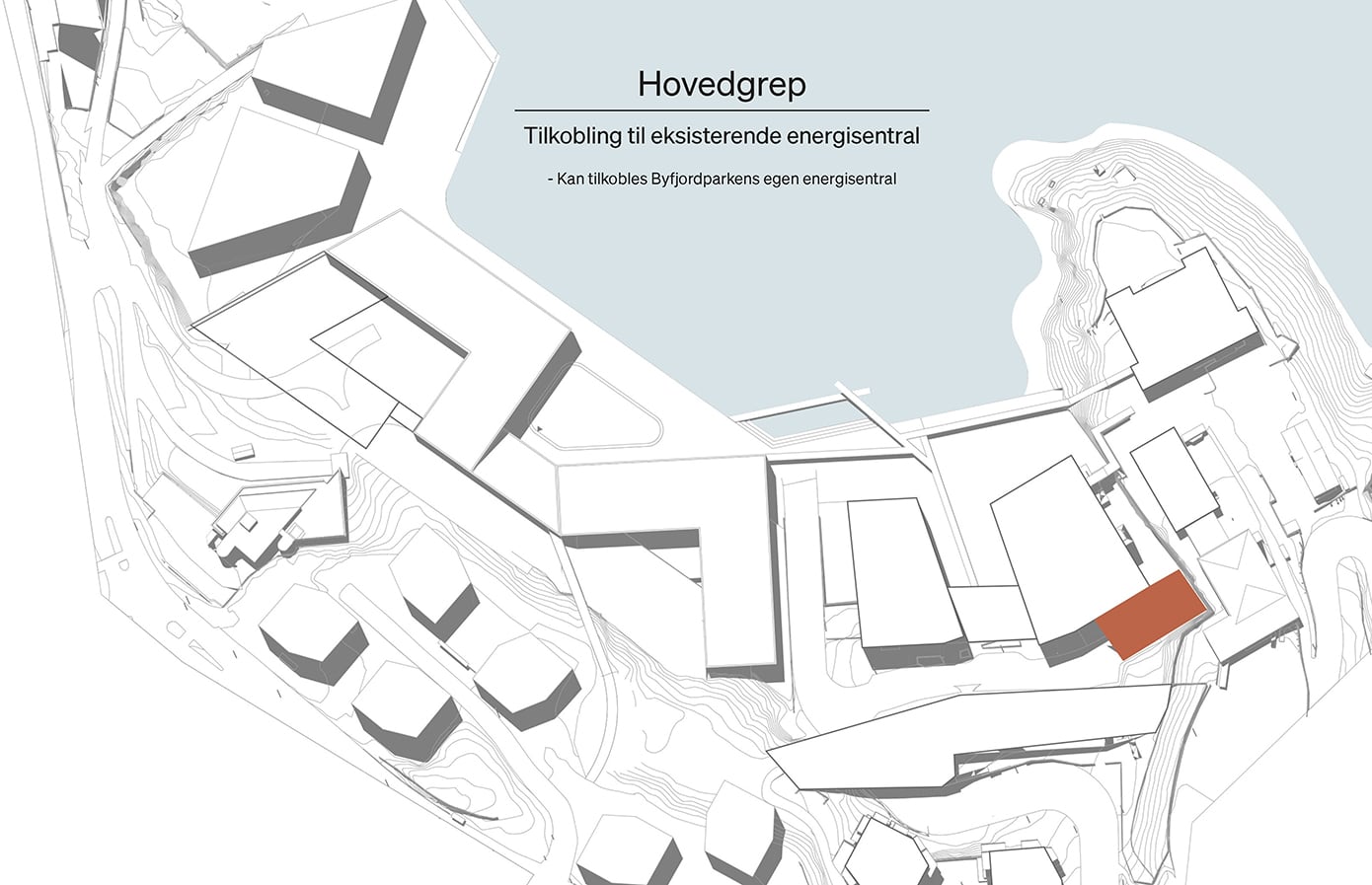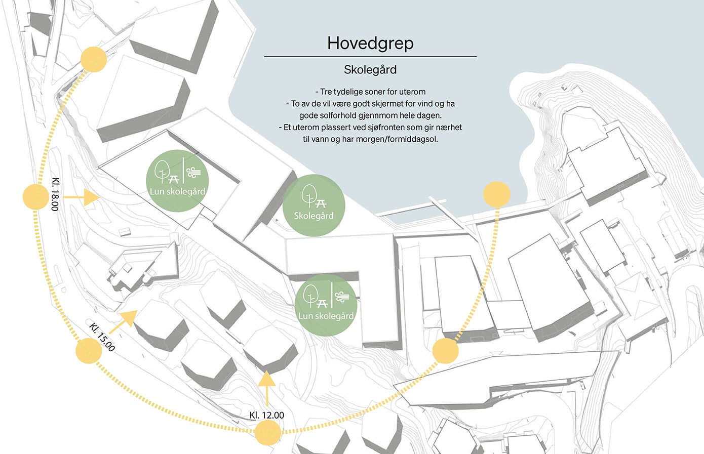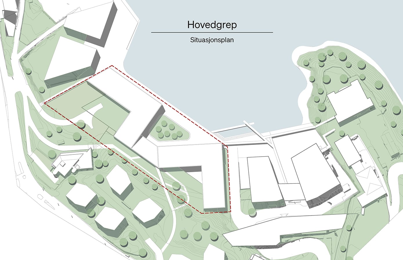 Hovedgrepet viser hvordan skolebygget kan plasseres og organiseres på tomten i samspill med eksisterende bygg og omgivelser. Grepet illustrerer en mulig struktur for volum, utearealer og forbindelser, der bygningene danner tydelige rammer for skolegård, gode møteplasser og effektive atkomster. Samtidig legges det til rette for gode koblinger til campusområdet, fjorden og omkringliggende bystruktur.