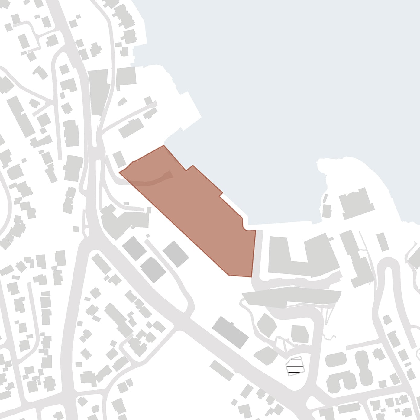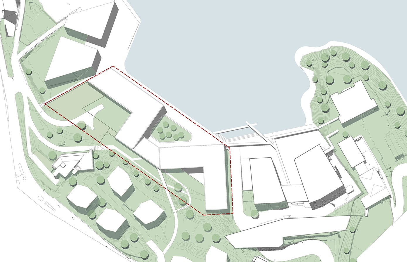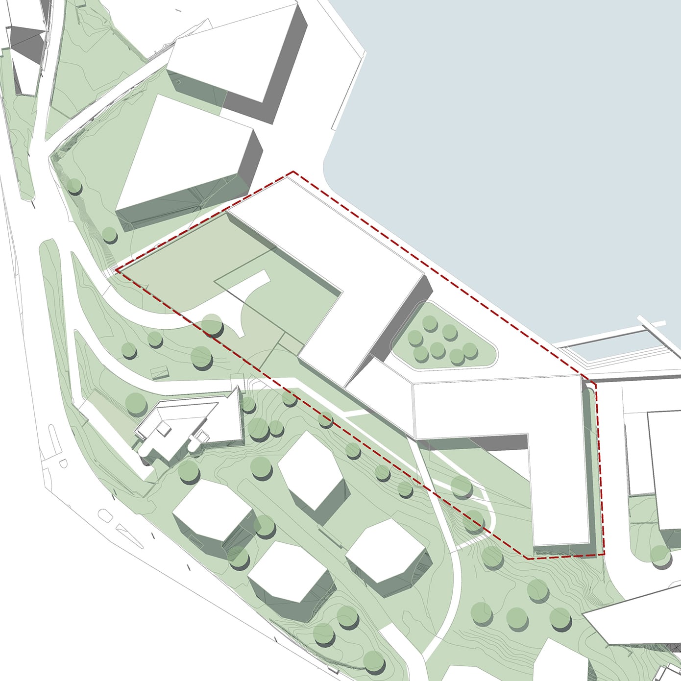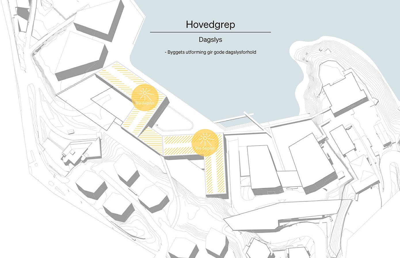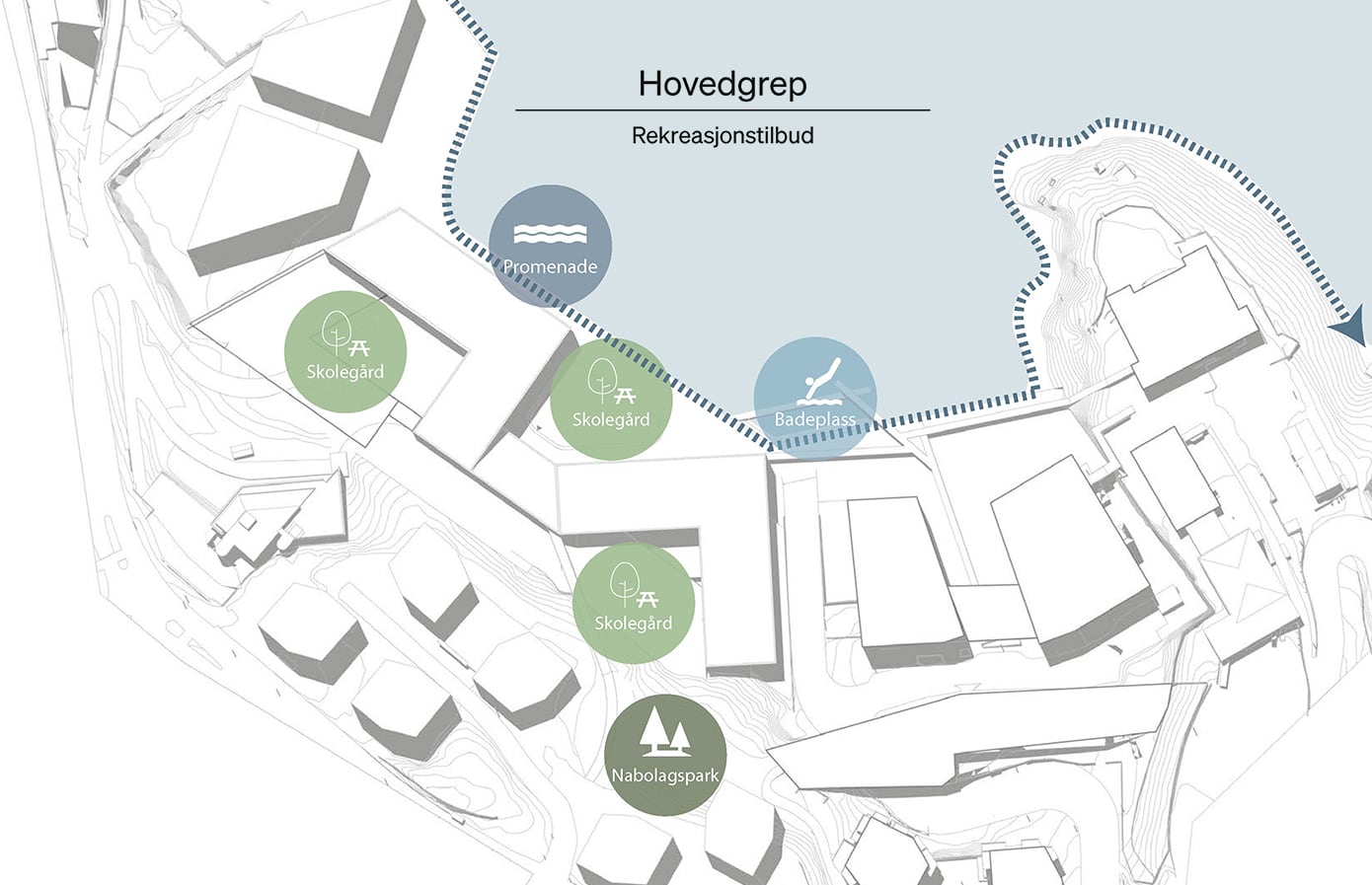 Hovedgrepet viser hvordan skolebygget kan plasseres og organiseres på tomten i samspill med eksisterende bygg og omgivelser. Grepet illustrerer en mulig struktur for volum, utearealer og forbindelser, der bygningene danner tydelige rammer for skolegård, gode møteplasser og effektive atkomster. Samtidig legges det til rette for gode koblinger til campusområdet, fjorden og omkringliggende bystruktur.