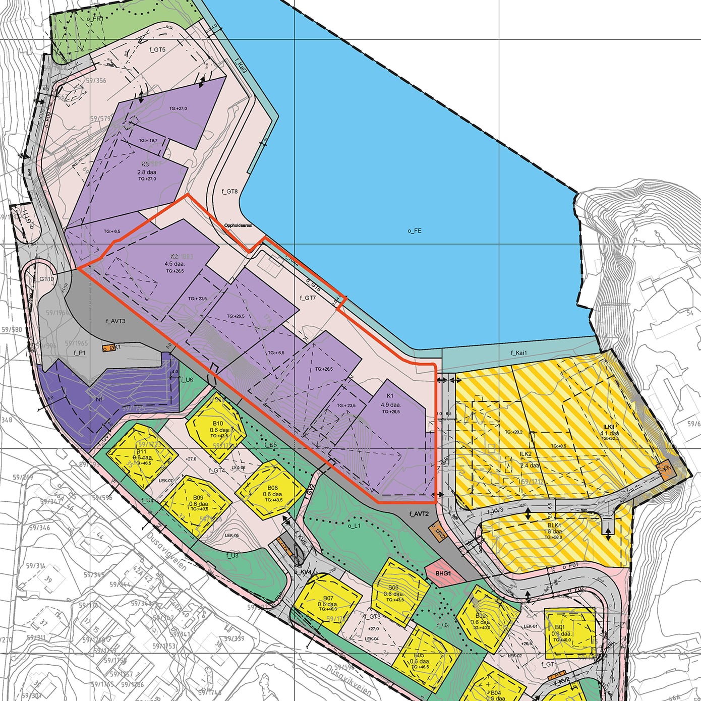 - Utsnitt av gjeldende plan med markert prosjektområde (rød linje).