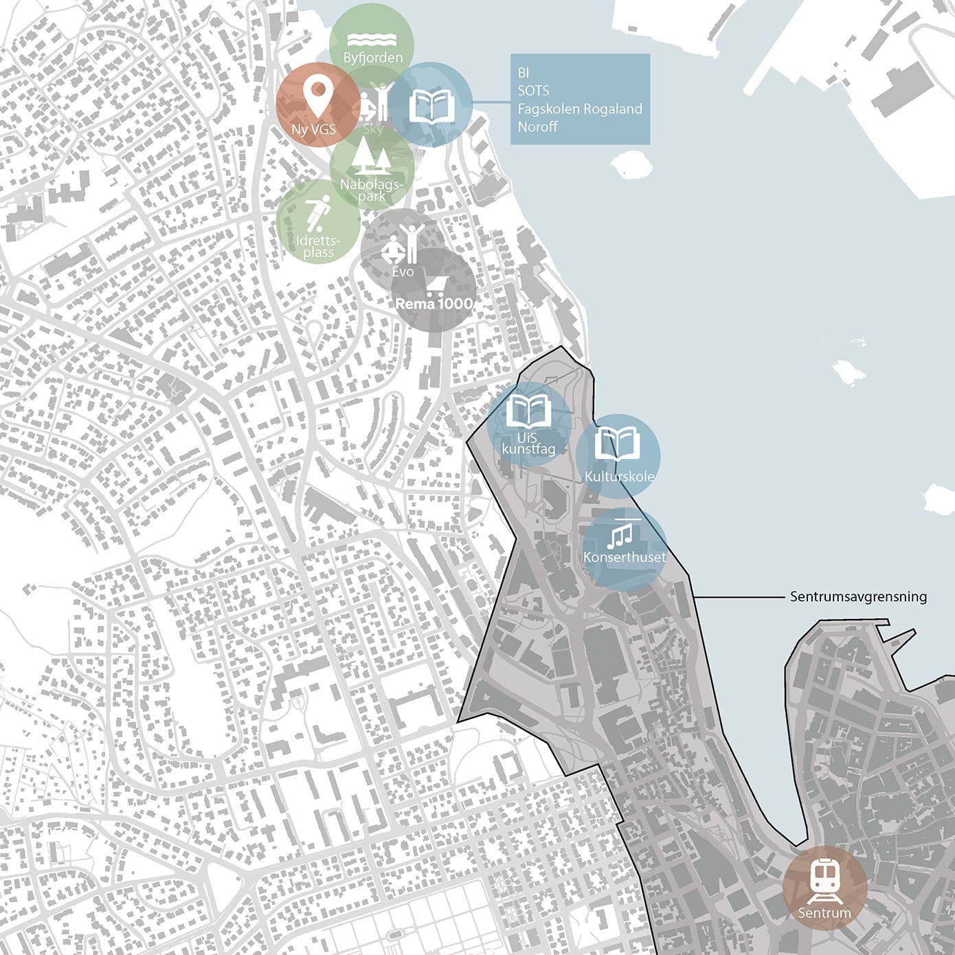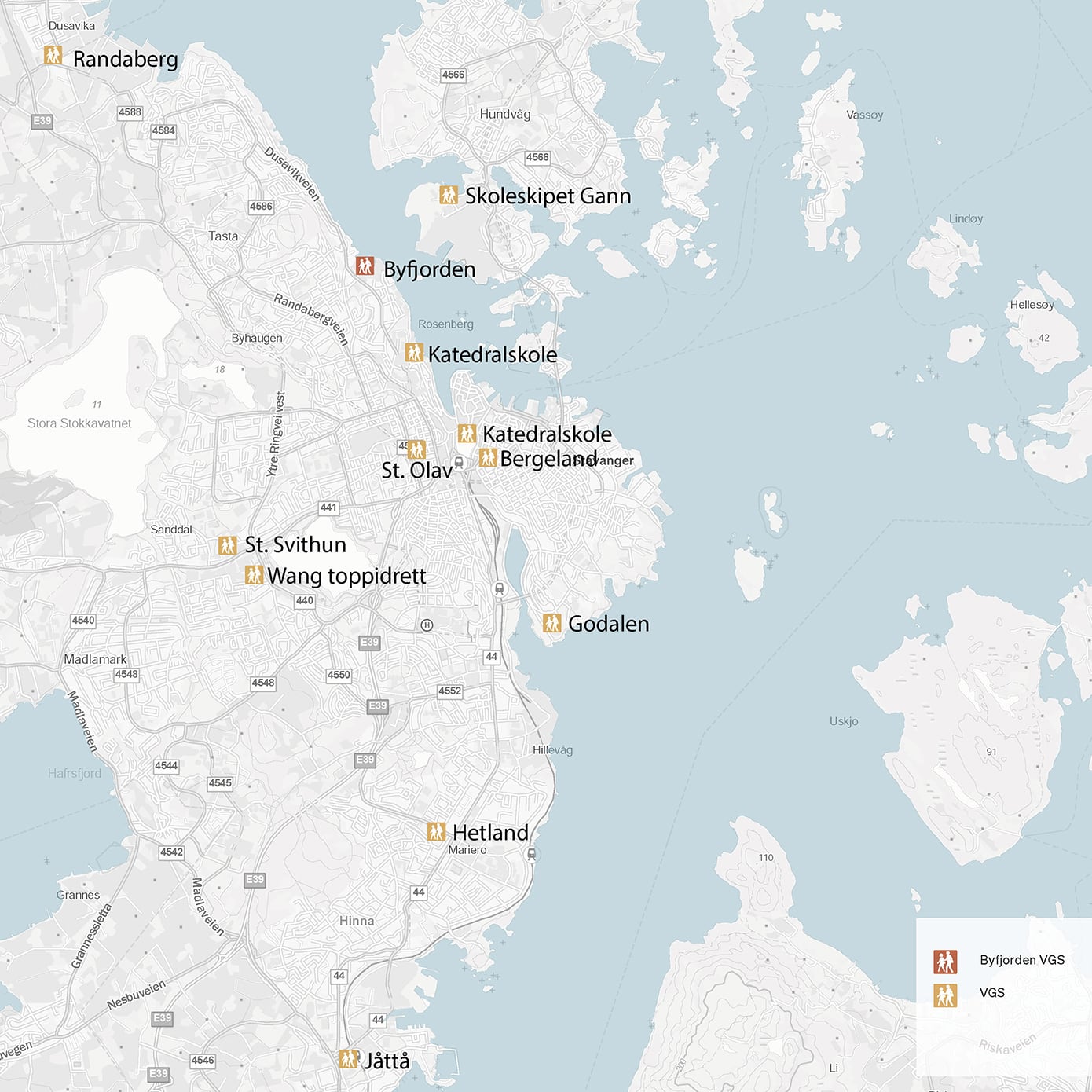 Kartet viser at videregående skoler i Stavanger er konsentrert i sentrum og sørover, mens det nord for sentrum ikke finnes tilbud før Randaberg VGS. En ny videregående skole i Byfjordparken vil gi bedre geografisk balanse og kortere reisevei for elever i de nordlige bydelene.