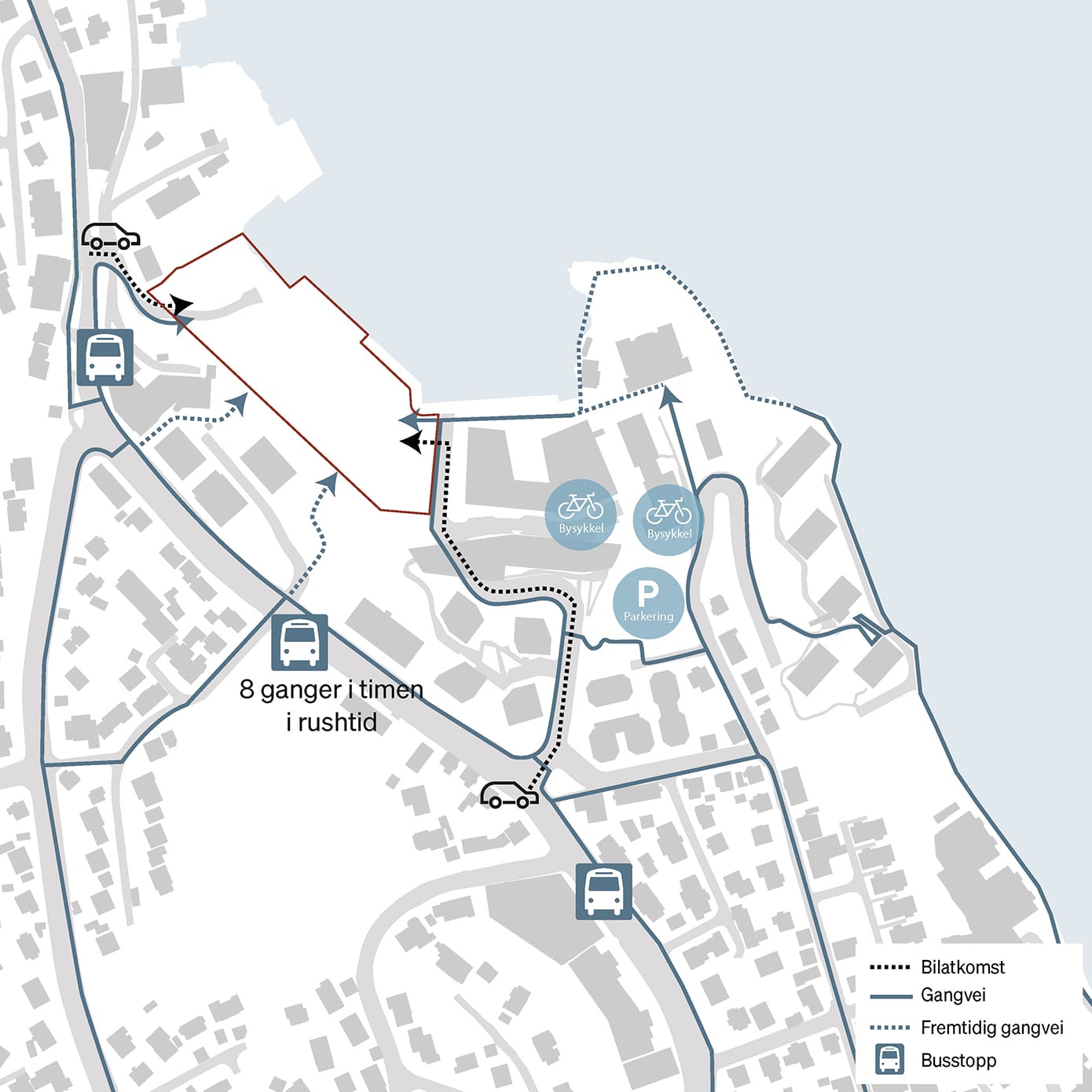 Campus Byfjordparken vil ha nærhet til kollektivtransport med busser opptil 8 ganger i timen i rushtid, samt elsykkelstasjoner og parkering for elsparkesykler.