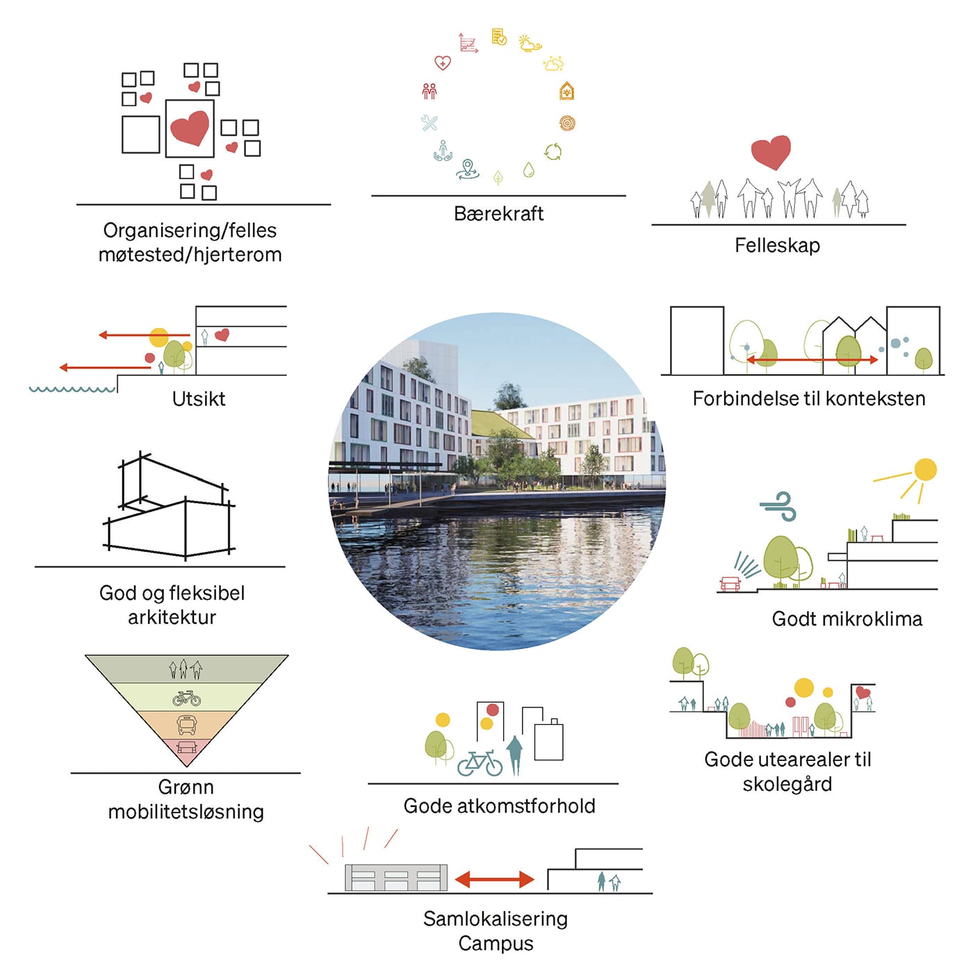 Arkitekturen skal være fleksibel, robust og tilpasningsdyktig, slik at bygget kan utvikle seg i takt med fremtidens undervisningsformer. Bygget åpner seg mot fjorden og gir gode utsiktsforhold, samtidig som det knytter seg til det eksisterende campusmiljøet i området og styrker samlokaliseringen av utdanningsinstitusjoner.